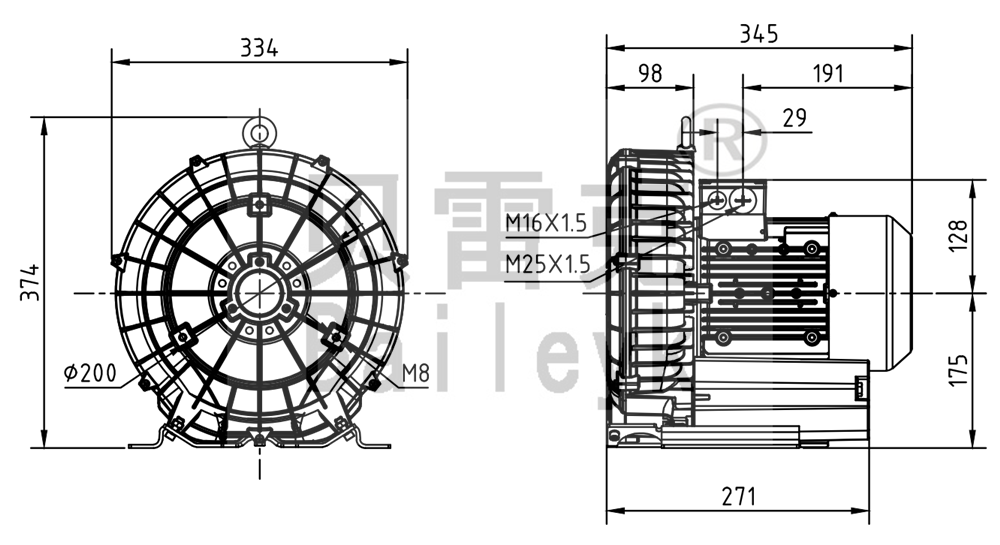 最大風量:210m3/h 最大正壓:190mbar 最大負壓:200mbar 防護等級:IP55 噪音:64db 重量:23Kg