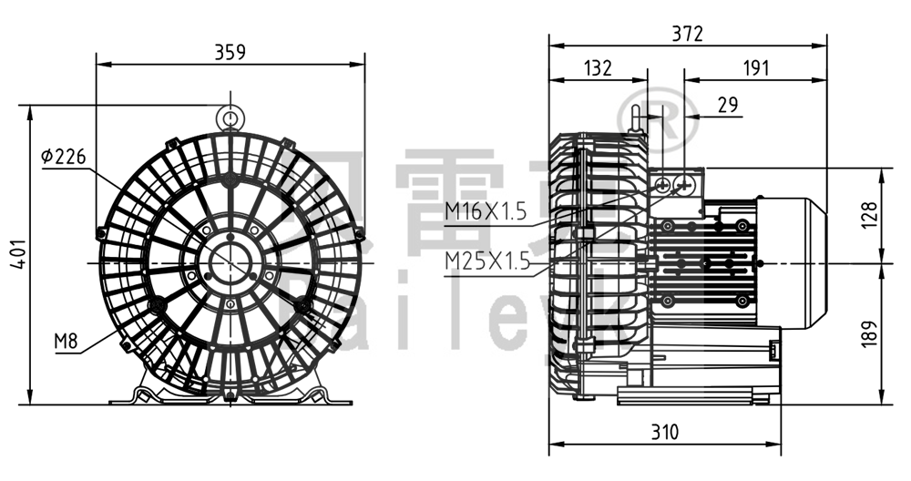 最大風(fēng)量:345m3/h 最大正壓:125mbar 最大負(fù)壓:125mbar 防護(hù)等級:IP55 噪音:70db 重量:26Kg